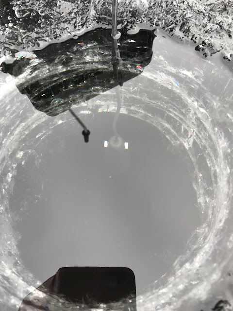 Dessverre kom jeg ikke helt ut dit jeg ville. Riktignok var isen fortsatt hele 10 cm tykk der jeg snudde, men da hadde jeg en markant iskant foran meg hvor isen på utsiden av kanten så rimelig nyfrossen ut. (Litt senere på dagen bekreftet en turgåer at det var åpent vann der så sent som onsdag.) Jeg fikk ta til takke med oppsøkende fiske, noe som er bra trening med 170mm isborr.