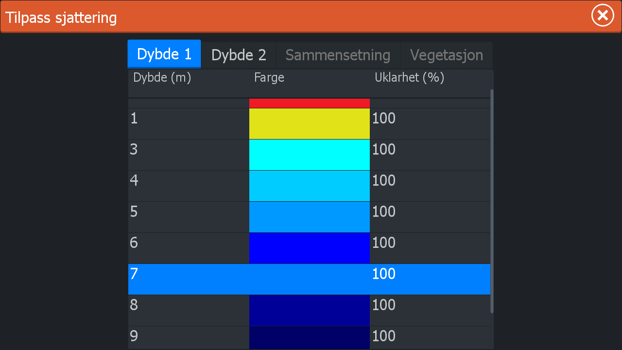 Som nevnt kan du legge til flere dybdeintervaller, du kan endre fargene, stokke om og få det slik du vil. Siden du har to paletter for dybde (Dybde 1 og Dybde 2) kan du ha en variant for dype innsjøer eller havet der du for eksempel vil ha 10 meters intervaller på fargene, og en for grunne innsjøer der du vil ha en meters intervall. Her er det bare å leke seg og få det slik man vil.