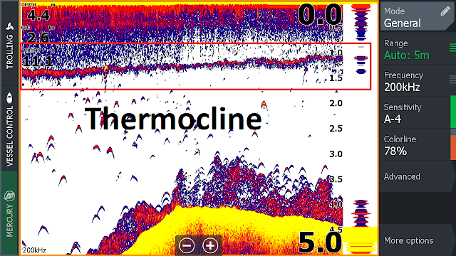 Since the ping from our transducer is influenced by density (the reason you see a fish at all is because it has higher density than the surrounding water) you can see a thermocline on your sonar.